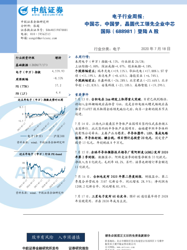 【中航证券】【20200718】20200718-中航证券-电子行业周报:中国芯,中国梦,晶圆代工领先企业中芯国际(688981)登陆A股-5页 行业研究