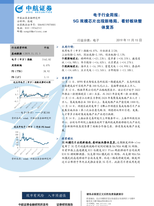 【中航证券】【20191115】20191115-中航证券-电子行业周报:5G双模芯片出现新格局,看好板块整体复苏-3页 行业研究