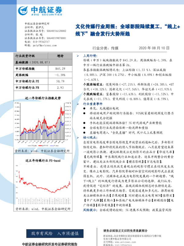 【中航证券】【20200810】20200810-中航证券-文化传媒行业周报:全球影院陆续复工,“线上+线下”融合发行大势所趋-7页 行业研究
