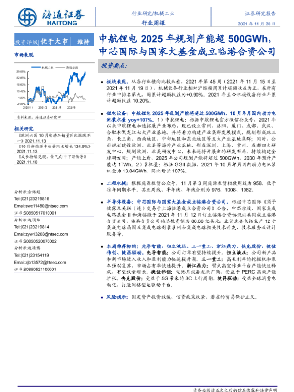 【海通证券】【20211120】20211120-海通证券-机械工业行业周报:中航锂电2025年规划产能超500GWh,中芯国际与国家大基金成立临港合资公司-9页 行业研究