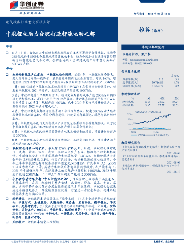 【华创证券】【20210811】电气设备行业重大事项点评:中航锂电助力合肥打造智能电动之都-4页 行业研究