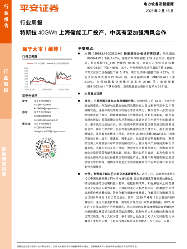 【平安证券】【20250216】电力设备及新能源行业周报:特斯拉40GWh上海储能工厂投产,中英有望加强海风合作-23页 行业研究