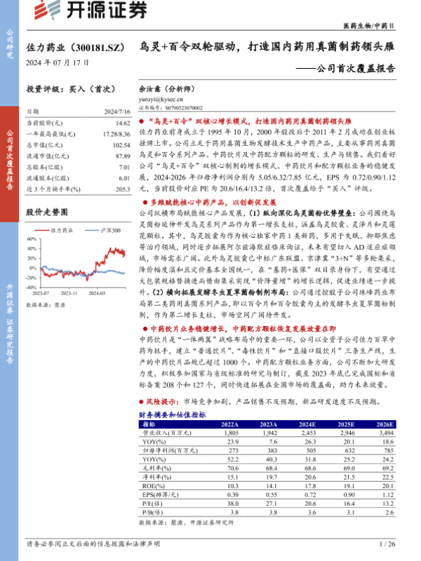 【开源证券】【20240717】佐力药业:乌灵+百令双轮驱动,打造国内药用真菌制药领头雁-26页 公司研究