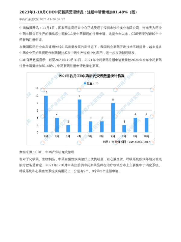 【中商产业研究院】【2021】2021年1-10月CDE中药新药受理情况:注册申请量增加81.48%-2页 行业研究