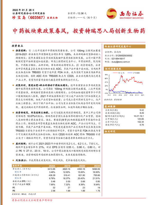 【西南证券】【20220128】深度报告-20220128-西南证券-珍宝岛-603567.SH-中药板块乘政策春风_投资特瑞思入局创新生物药-23页 行业研究