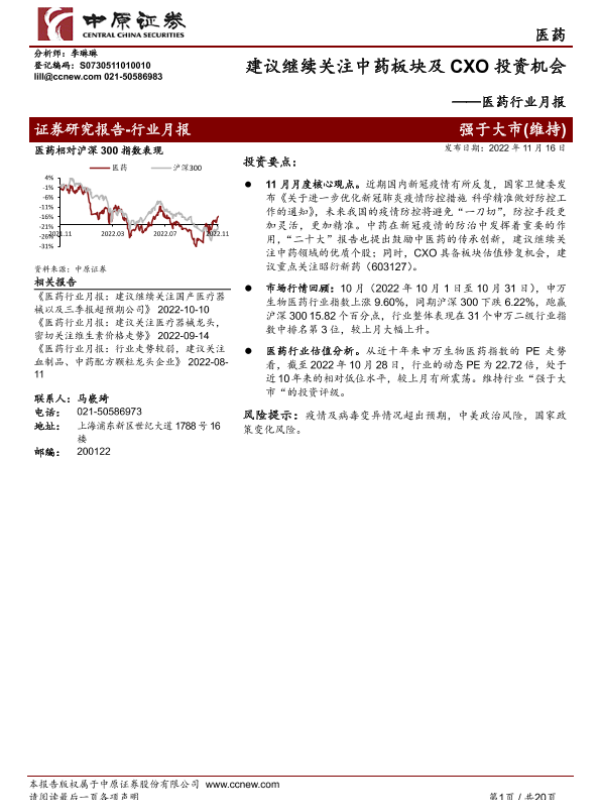 【中原证券】【20221116】建议继续关注中药板块及CXO投资机会-20页 行业研究