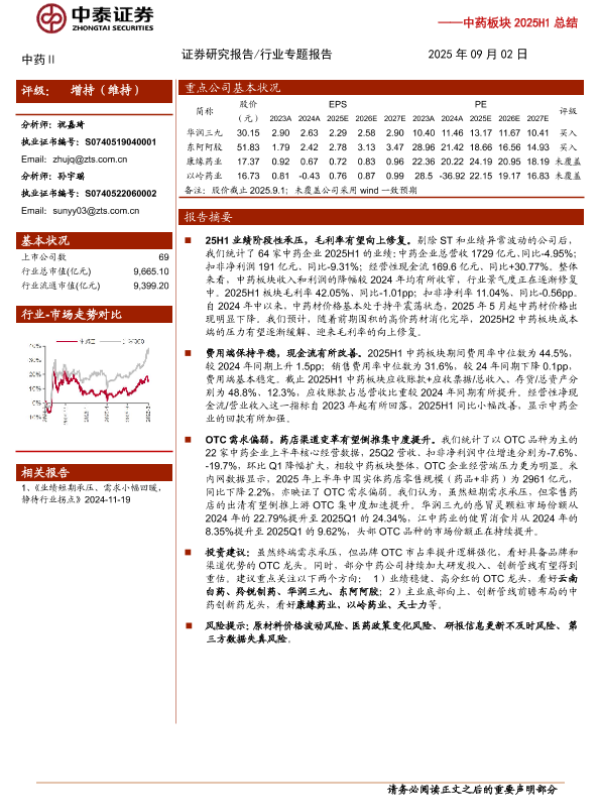 【中泰证券】【202509】中药板块2025H1总结:业绩短期承压,静待需求回暖-10页 证券期货研究报告