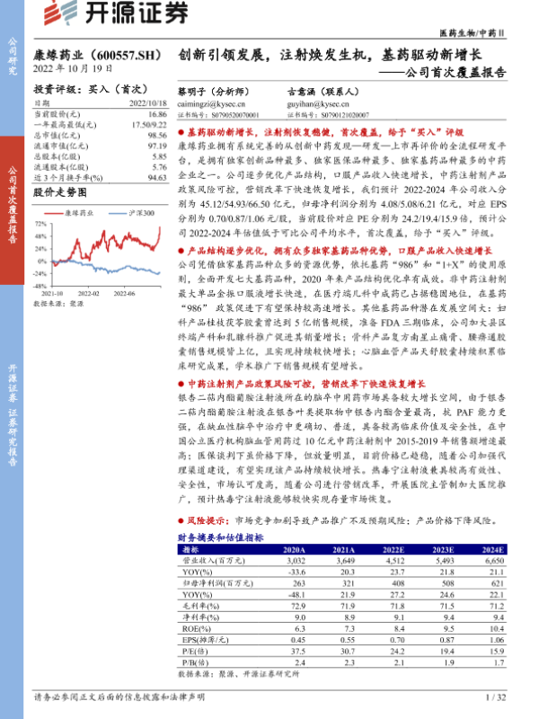 【开源证券】【20221019】康缘药业-600557.SH-公司首次覆盖报告:创新引领发展,注射焕发生机,基药驱动新增长-32页 行业研究