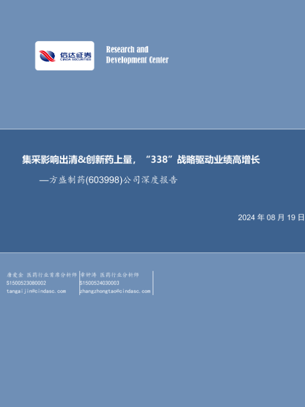 【信达证券】【20240819】方盛制药(603998)公司深度报告:集采影响出清&创新药上量,“338”战略驱动业绩高增长-34页 行业研究