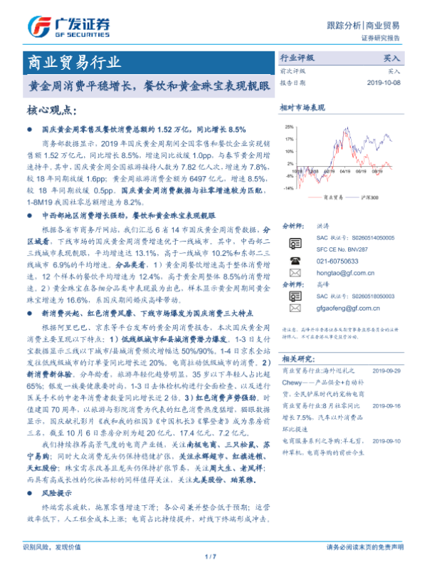 【广发证券】【20191008】黄金周消费平稳增长,餐饮和黄金珠宝表现靓眼-7页 行业研究