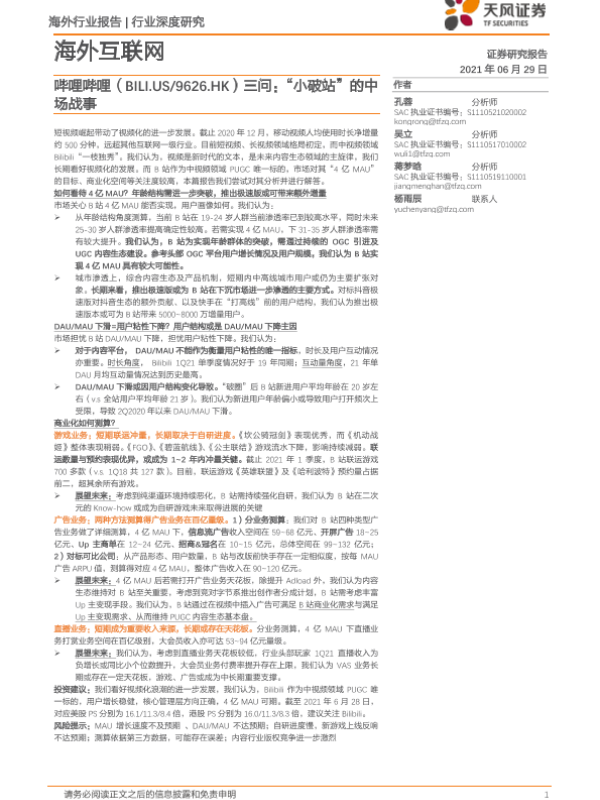 【天风证券】【20210629】哔哩哔哩三问:“小破站”的中场战事-34页 行业研究