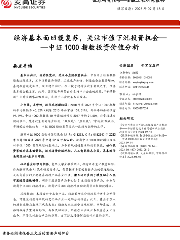 【麦高证券】【20230918】中证1000指数投资价值分析:经济基本面转好,关注市值下沉投资机会-20页 行业研究