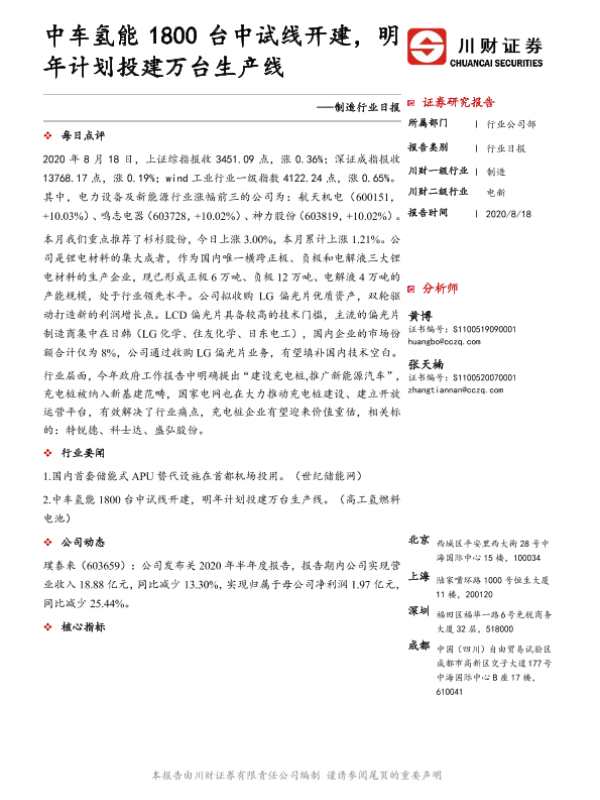 【川财证券】【20200818】制造行业日报:中车氢能1800台中试线开建,明年计划投建万台生产线-3页 证券期货研究报告