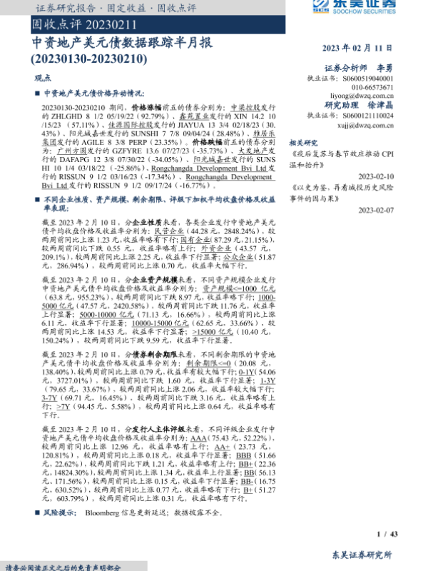 【东吴证券】【20230211】固收点评:中资地产美元债数据跟踪半月报-43页 行业研究