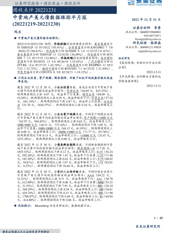 【东吴证券】【20221231】固收点评:中资地产美元债数据跟踪半月报-20221231-43页 行业研究
