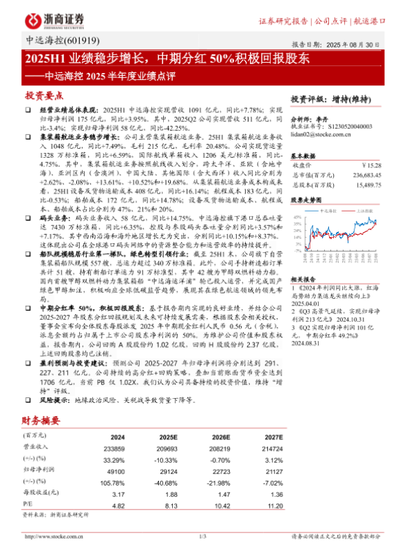 【浙商证券】【202508】中远海控-2025H1业绩稳步增长,中期分红50%积极回报股东-3页 证券期货研究报告