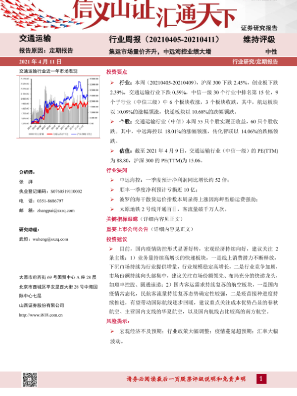 【山西证券】【20210411】交通运输行业周报:集运市场量价齐升,中远海控业绩大增-14页 行业研究