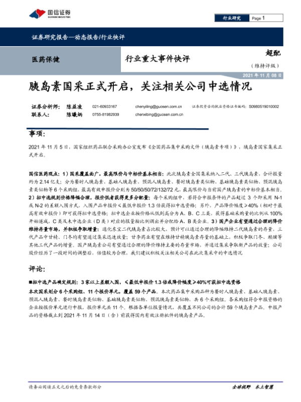 【国信证券】【20211108】医药保健行业重大事件快评:胰岛素国采正式开启,关注相关公司中选情况-9页 行业研究