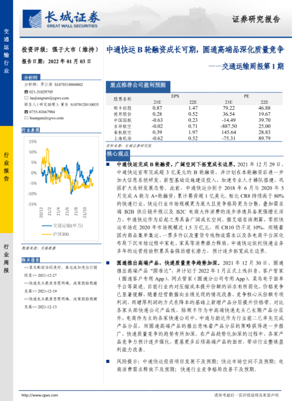 【长城证券】【20220103】中通快运B轮融资成长可期,圆通高端品深化质量竞争-30页 行业研究