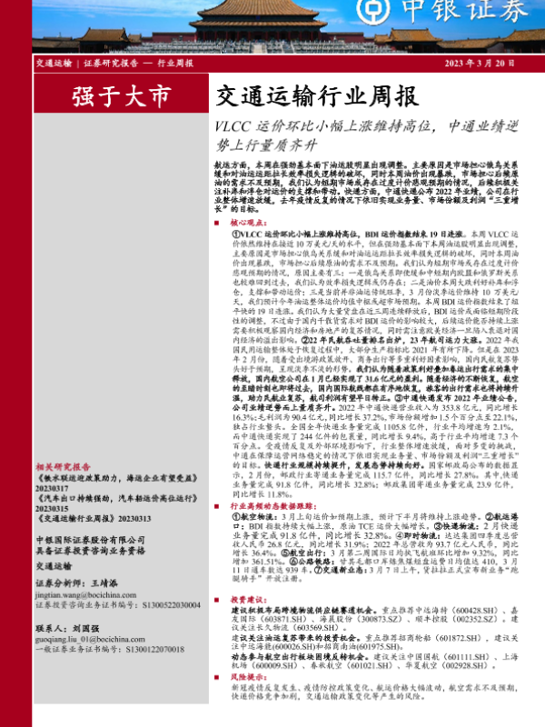 【中银证券】【20230320】交通运输行业周报:VLCC运价环比小幅上涨维持高位,中通业绩逆势上行量质齐升-29页 行业研究