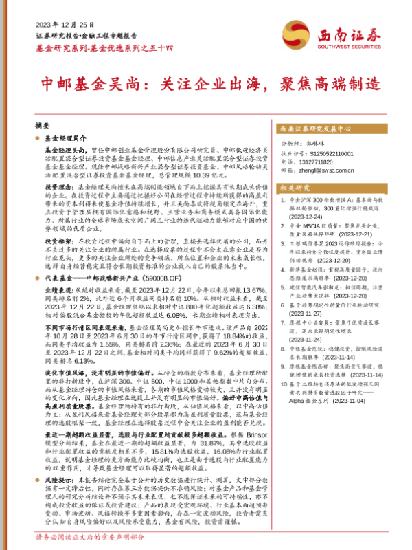 【西南证券】【20231225】基金优选系列之五十四:中邮基金吴尚:关注企业出海,聚焦高端制造-24页 行业研究