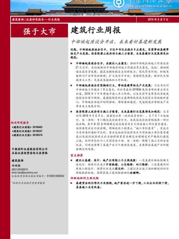 【中银证券】【20190605】建筑行业周报:中部崛起座谈会开启,未来看好基建新发展-15页 行业研究