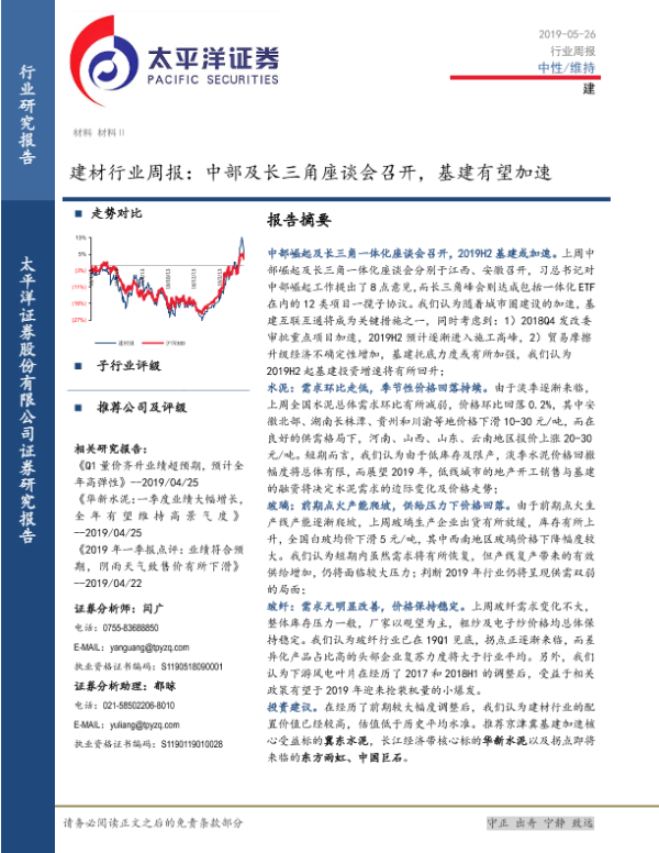 【太平洋证券】【20190526】建材行业周报:中部及长三角座谈会召开,基建有望加速-19页 行业研究