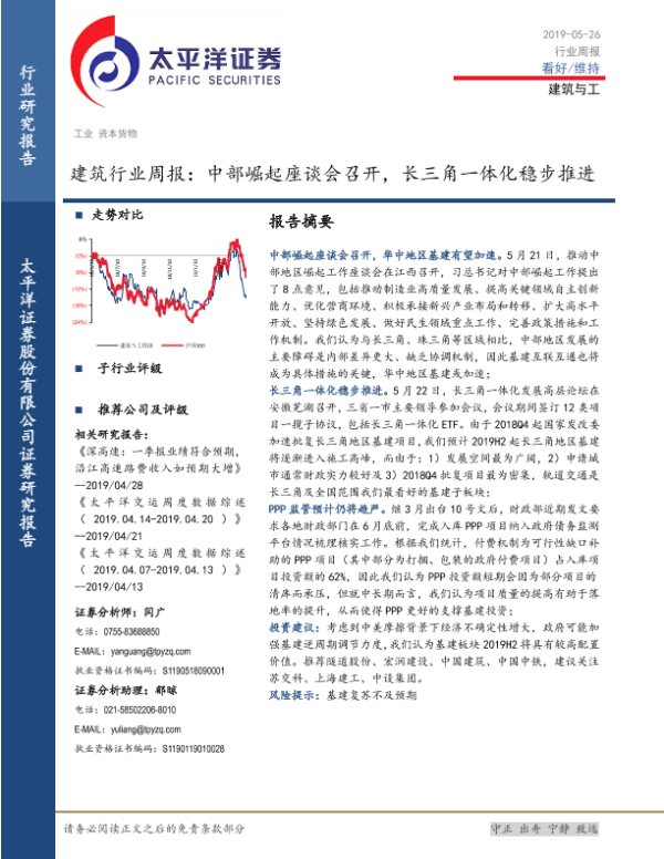 【太平洋证券】【20190526】建筑行业周报:中部崛起座谈会召开,长三角一体化稳步推进-14页 行业研究
