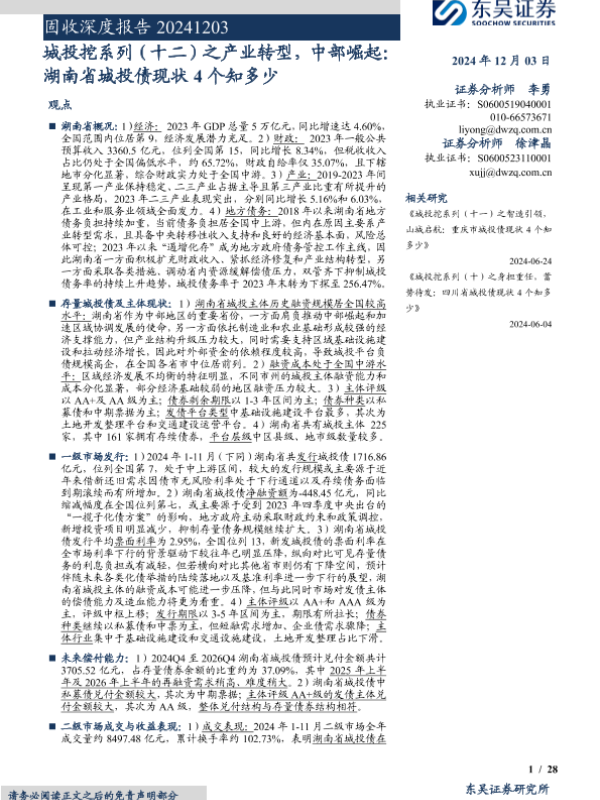 【东吴证券】【20241203】城投挖系列(十二)之产业转型,中部崛起:湖南省城投债现状4个知多少-28页 行业研究