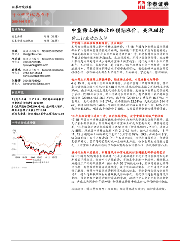 【华泰证券】【20190417】20190417-华泰证券-稀土行业动态点评:中重稀土供给收缩预期涨价,关注磁材-3页 行业研究