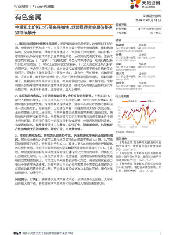 【天风证券】【20200531】20200531-天风证券-有色金属行业研究周报:中重稀土价格上行带来强弹性,继续推荐贵金属价格有望继续攀升-13页 行业研究