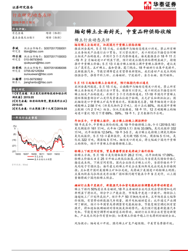 【华泰证券】【20190516】稀土行业动态点评:缅甸稀土全面封关,中重品种供给收缩-4页 行业研究