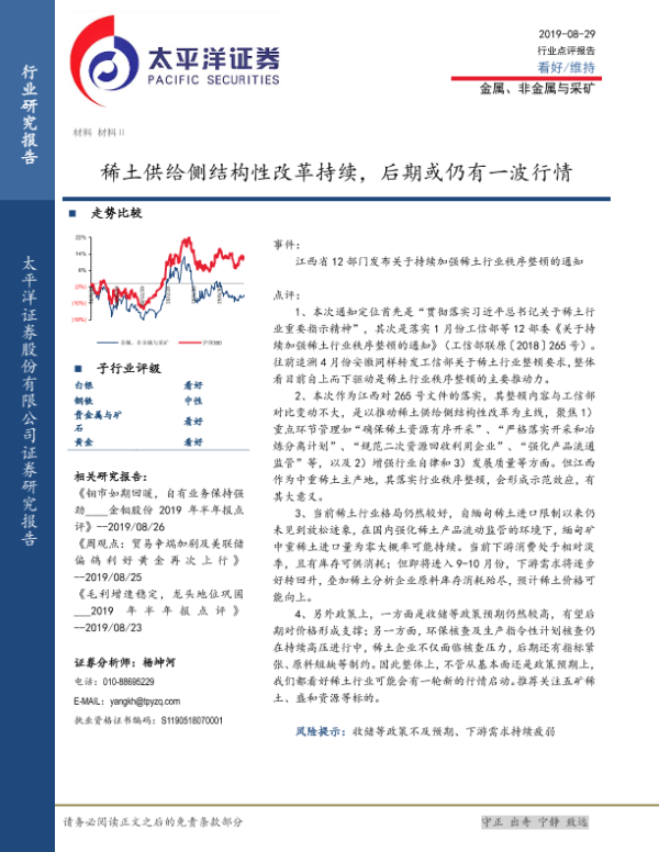 【太平洋证券】【20190829】稀土供给侧结构性改革持续,后期或仍有一波行情-3页 行业研究