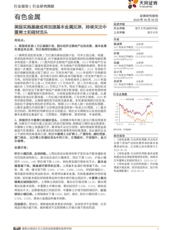 【天风证券】【20190505】20190505-天风证券-有色金属行业研究周报:美国实施基建或将加速基本金属反弹,持续关注中重稀土和磁材龙头-13页 行业研究