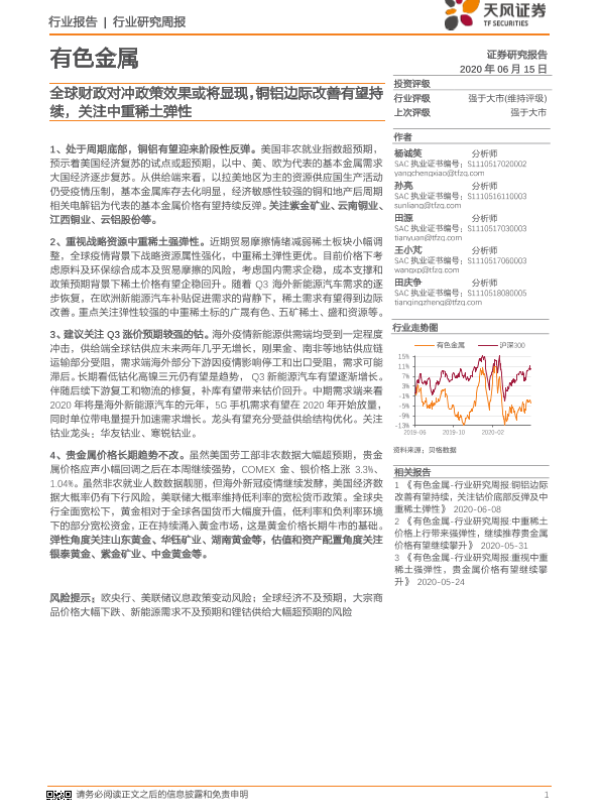 【天风证券】【20200615】20200615-天风证券-有色金属行业研究周报:全球财政对冲政策效果或将显现,铜铝边际改善有望持续,关注中重稀土弹性-12页 行业研究