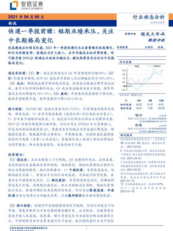 【安信证券】【20210406】快递一季报前瞻:短期业绩承压,关注中长期格局变化-11页 行业研究