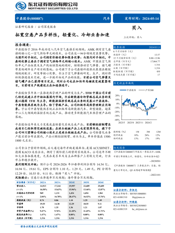 【东北证券】【20240514】中鼎股份(000887)拓宽空悬产品多样性,轻量化、冷却业务加速-31页 行业研究
