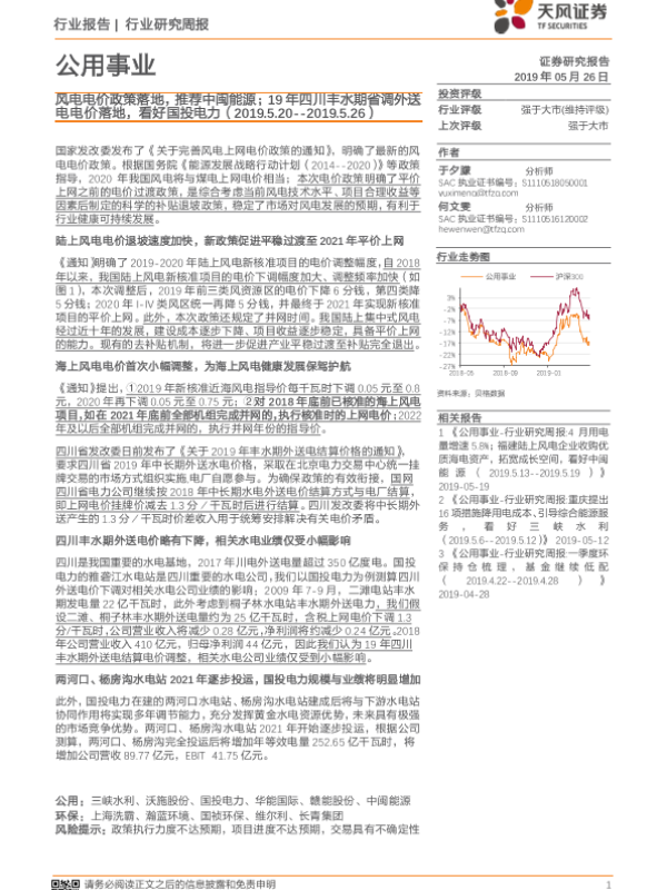 【天风证券】【20190526】公用事业行业研究周报:风电电价政策落地,推荐中闽能源;19年四川丰水期省调外送电电价落地,看好国投电力-11页 行业研究