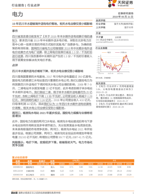【天风证券】【20190521】19年四川丰水期省调外送电电价落地,相关水电业绩仅受小幅影响-2页 行业研究