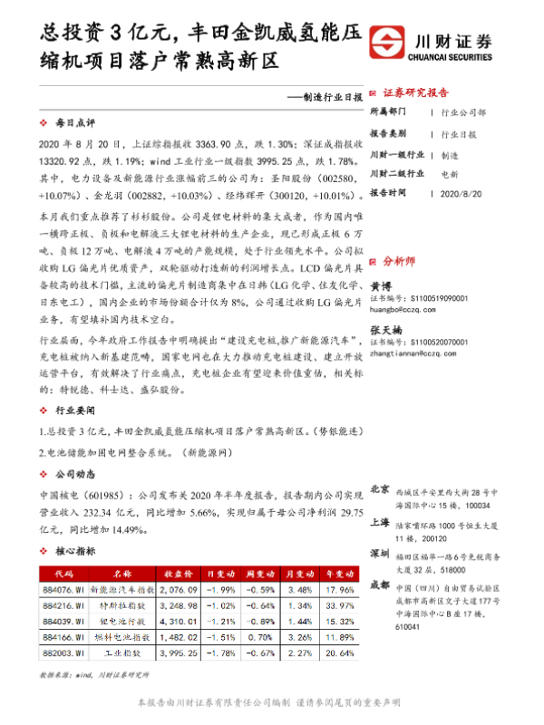 【川财证券】【20200820】制造行业日报:总投资3亿元,丰田金凯威氢能压缩机项目落户常熟高新区-3页 证券期货研究报告