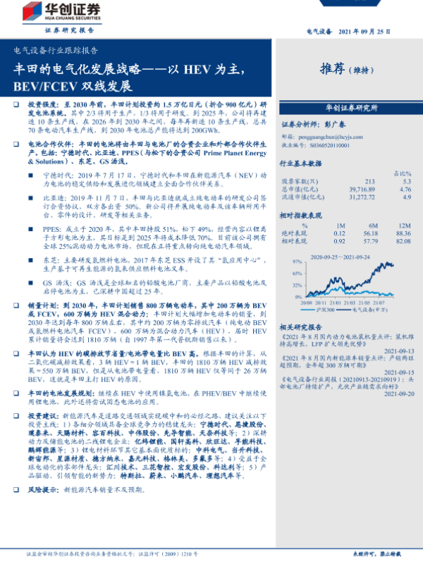 【华创证券】【20210925】电气设备行业跟踪报告:丰田的电气化发展战略——以 HEV 为主,BEV FCEV 双线发展-4页 行业研究
