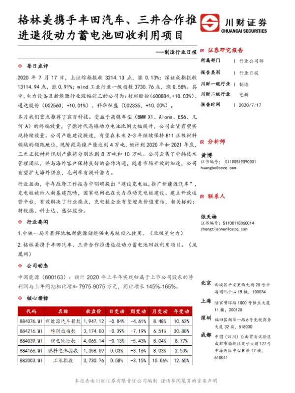 【川财证券】【20200717】制造行业日报:格林美携手丰田汽车、三井合作推进退役动力蓄电池回收利用项目-3页 证券期货研究报告