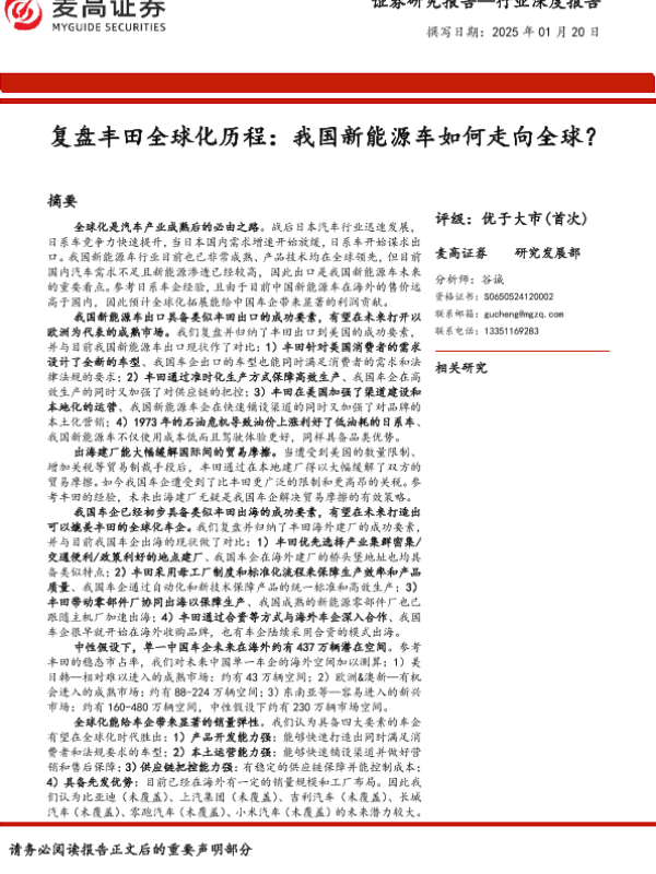 【麦高证券】【20250120】复盘丰田全球化历程:我国新能源车如何走向全球?-37页 行业研究