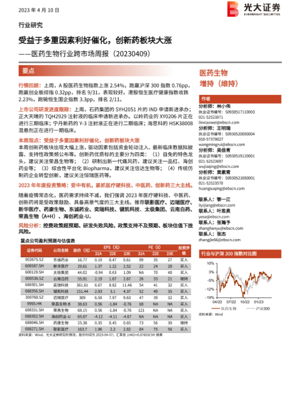 【光大证券】【20230410】医药生物行业跨市场周报:受益于多重因素利好催化,创新药板块大涨-22页 行业研究
