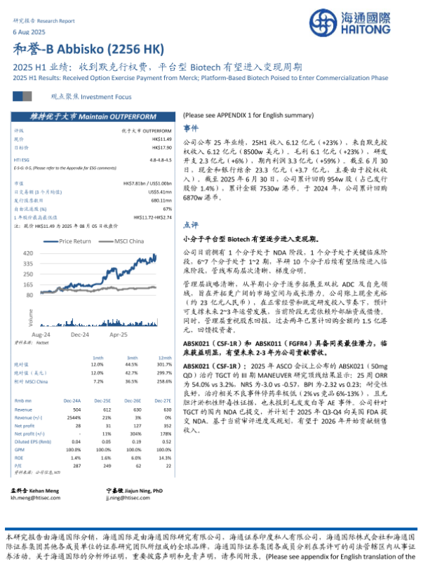【海通国际】【202508】2025 H1业绩:收到默克行权费,平台型 Biotech有望进入变现周期-16页 证券期货研究报告