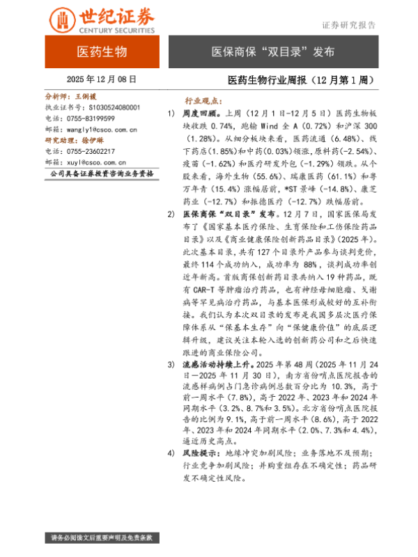 【世纪证券】【202512】医药生物行业周报(12月第1周):医保商保“双目录”发布-8页 证券期货研究报告