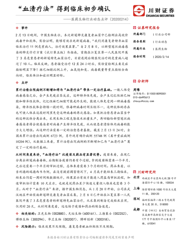 【川财证券】【20200214】“血清疗法”得到临床初步确认-2页 证券期货研究报告