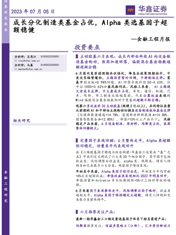 【华鑫证券】【20230705】金融工程月报:成长分化制造类基金占优,Alpha类选基因子超额稳健-15页 行业研究