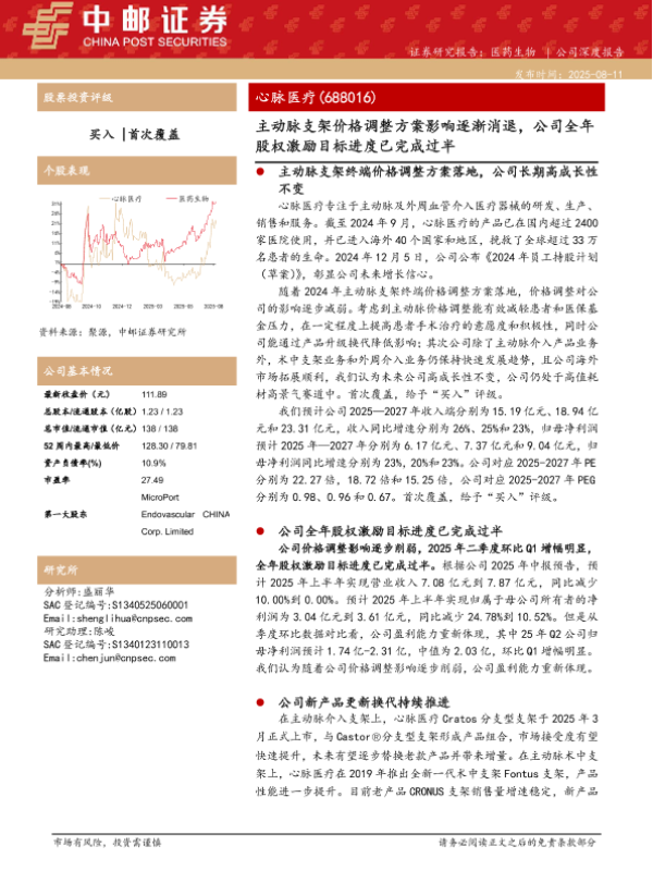 【中邮证券】【20250811】心脉医疗-主动脉支架价格调整方案影响逐渐消退,公司全年股权激励目标进度已完成过半-32页 证券期货研究报告
