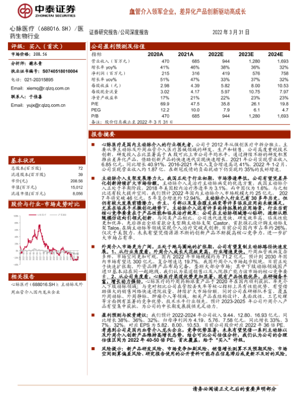 【中泰证券】【20220331】中泰证券-心脉医疗-688016.SH-血管介入领军企业,差异化产品创新驱动高成长-27页 行业研究